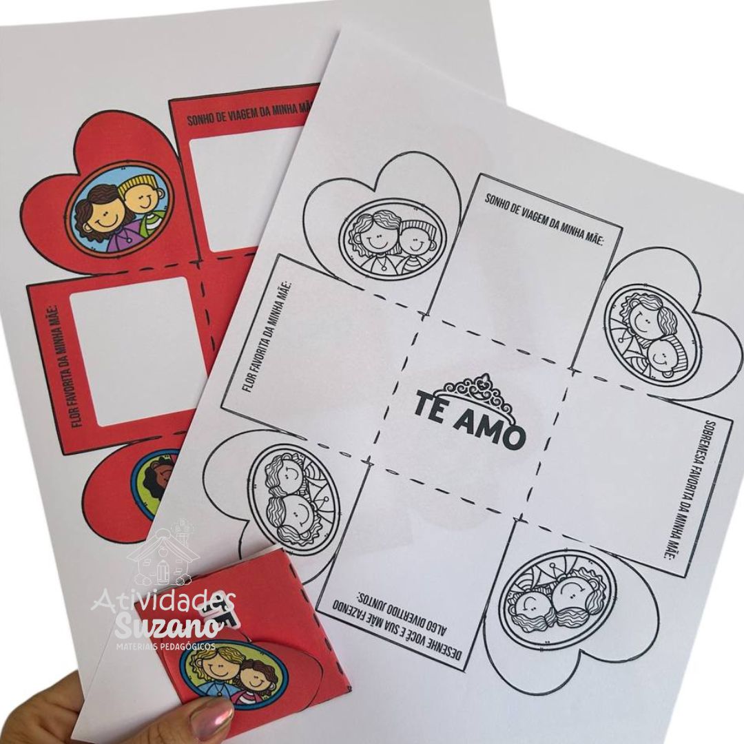 Cartão Interativo “Explosão de Amor”: Versão colorida pronta para montar e versão em preto e branco para a criança colorir e personalizar do seu jeitinho.