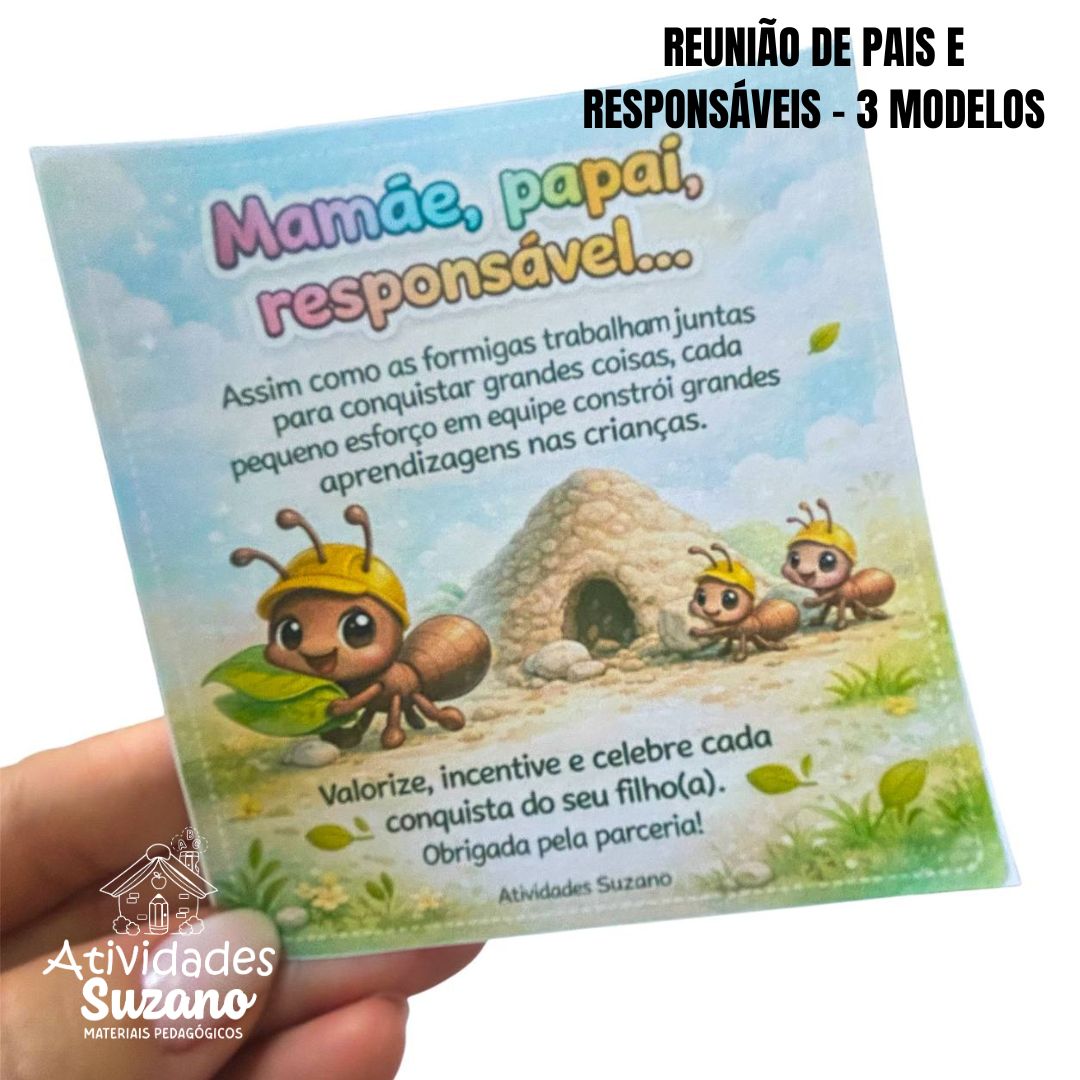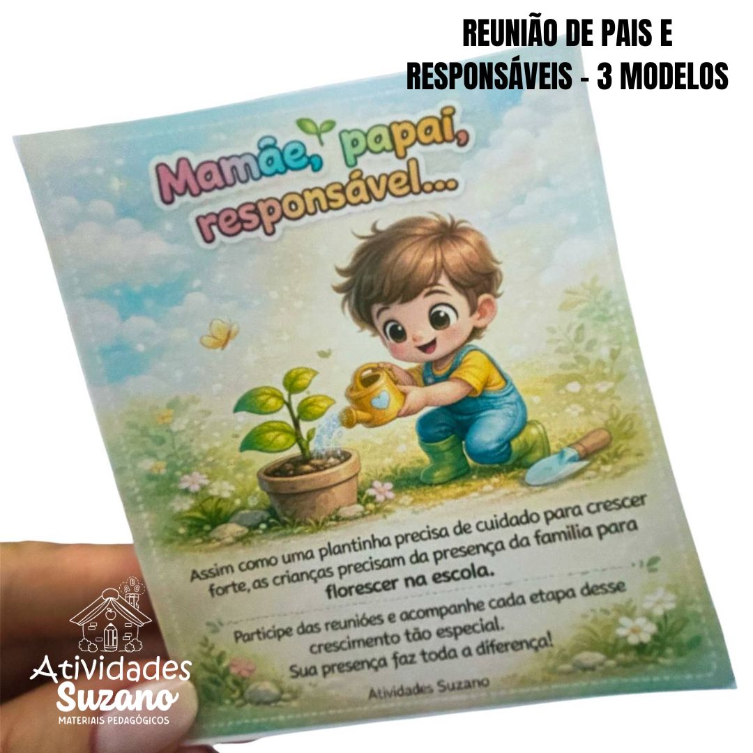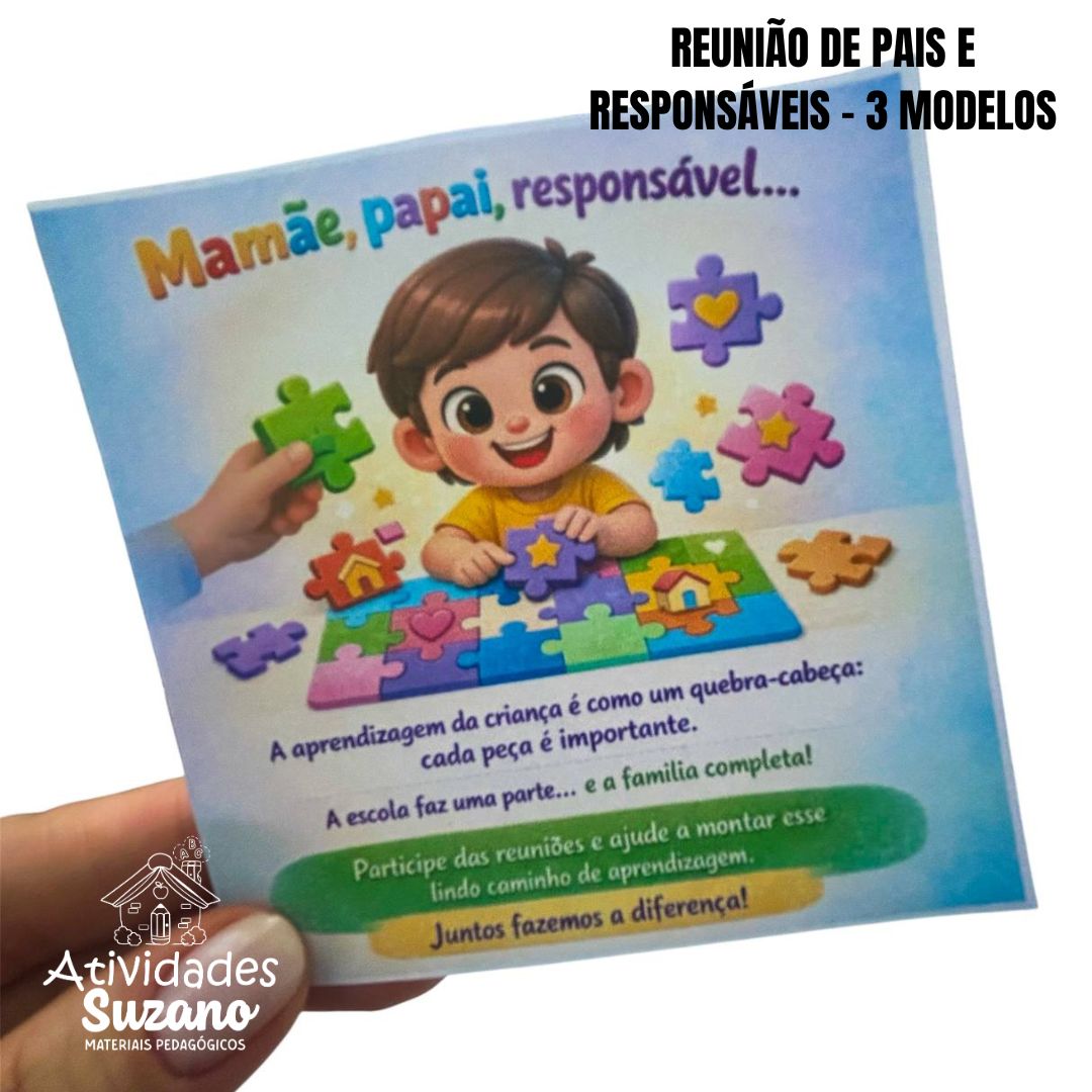 Este kit contém 3 cartões educativos para reunião escolar, em PDF, prontos para imprimir e entregar aos pais ou responsáveis.