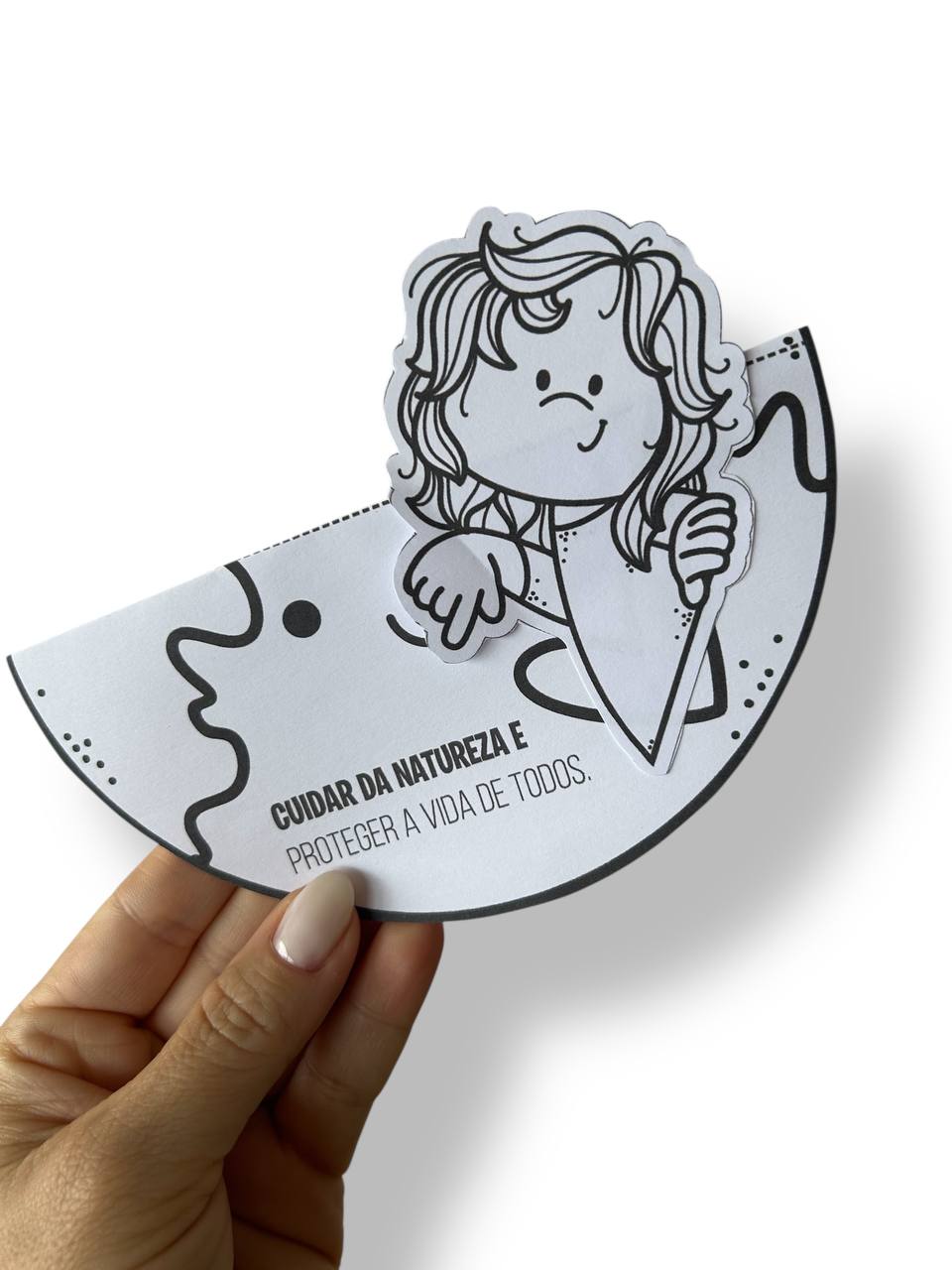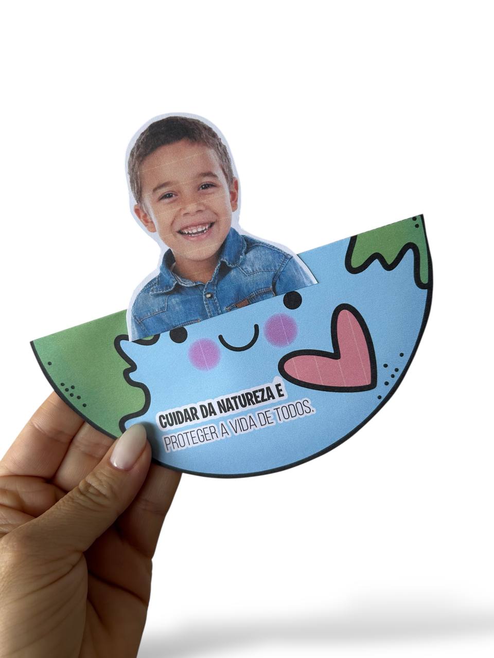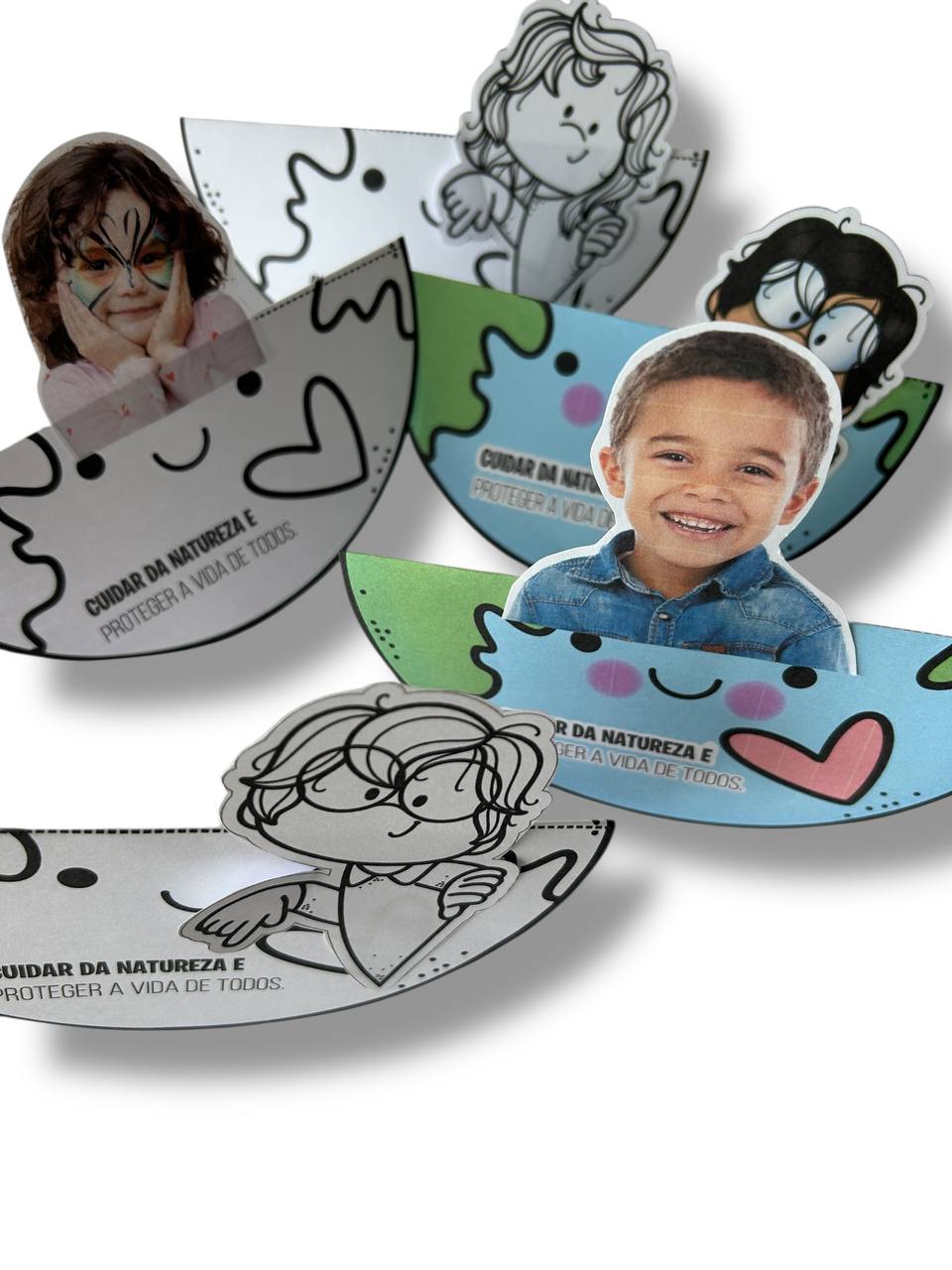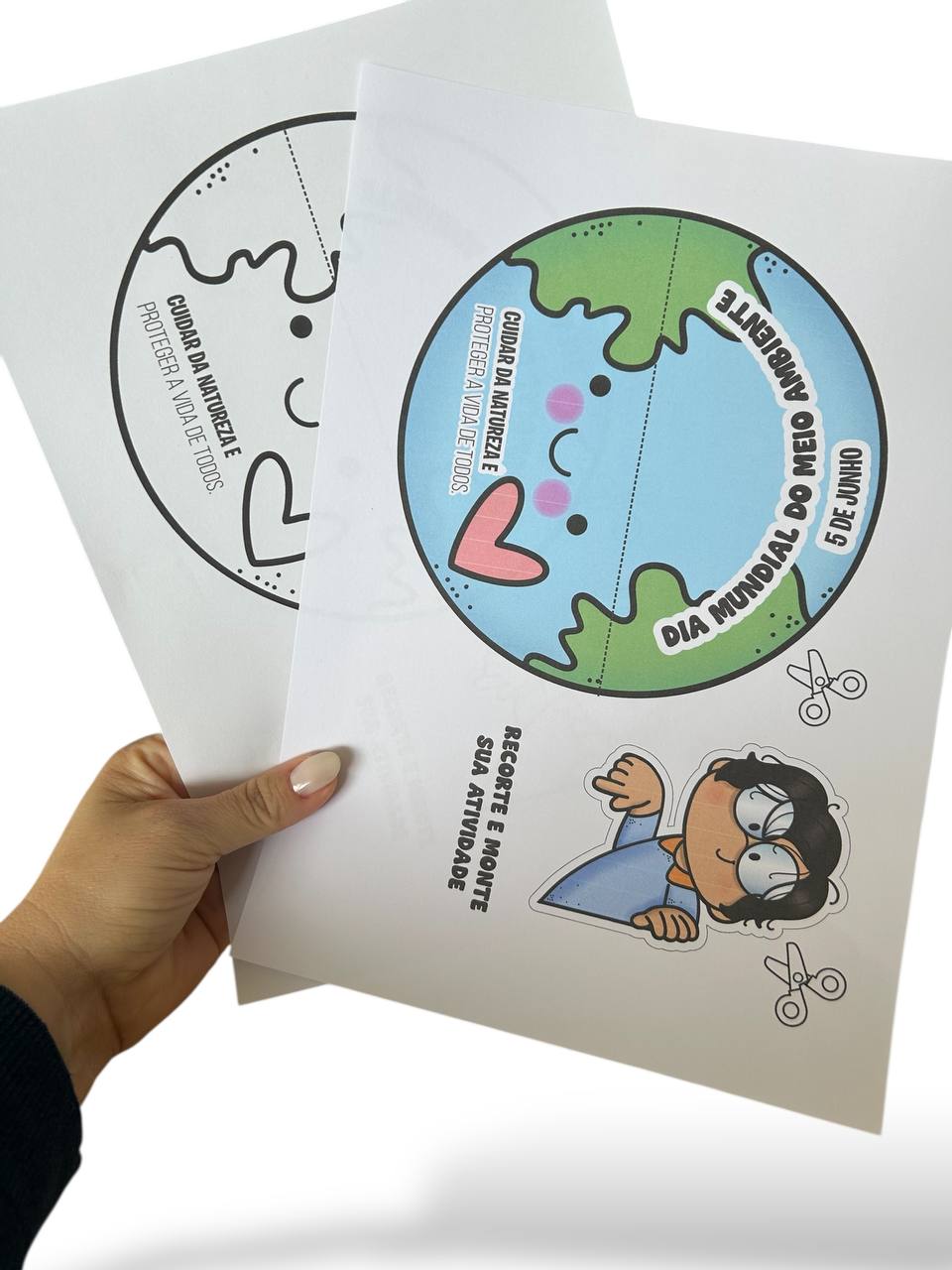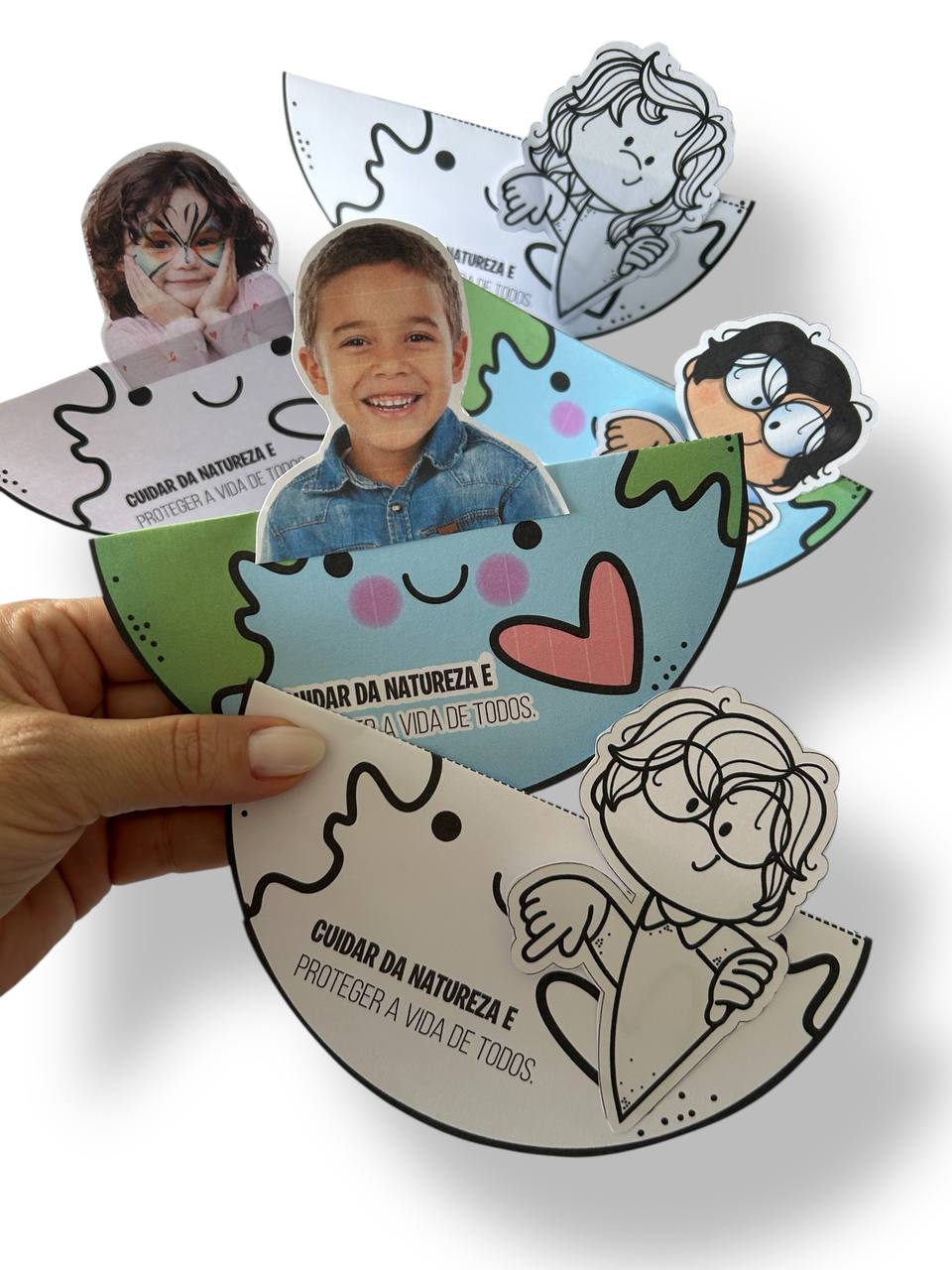 A atividade principal é um planeta que se dobra ao meio, onde a criança poderá colar ou desenhar o seu rostinho, representando que cada um de nós faz parte do cuidado com o planeta. Uma forma simbólica e encantadora de reforçar a importância da preservação ambiental desde cedo.