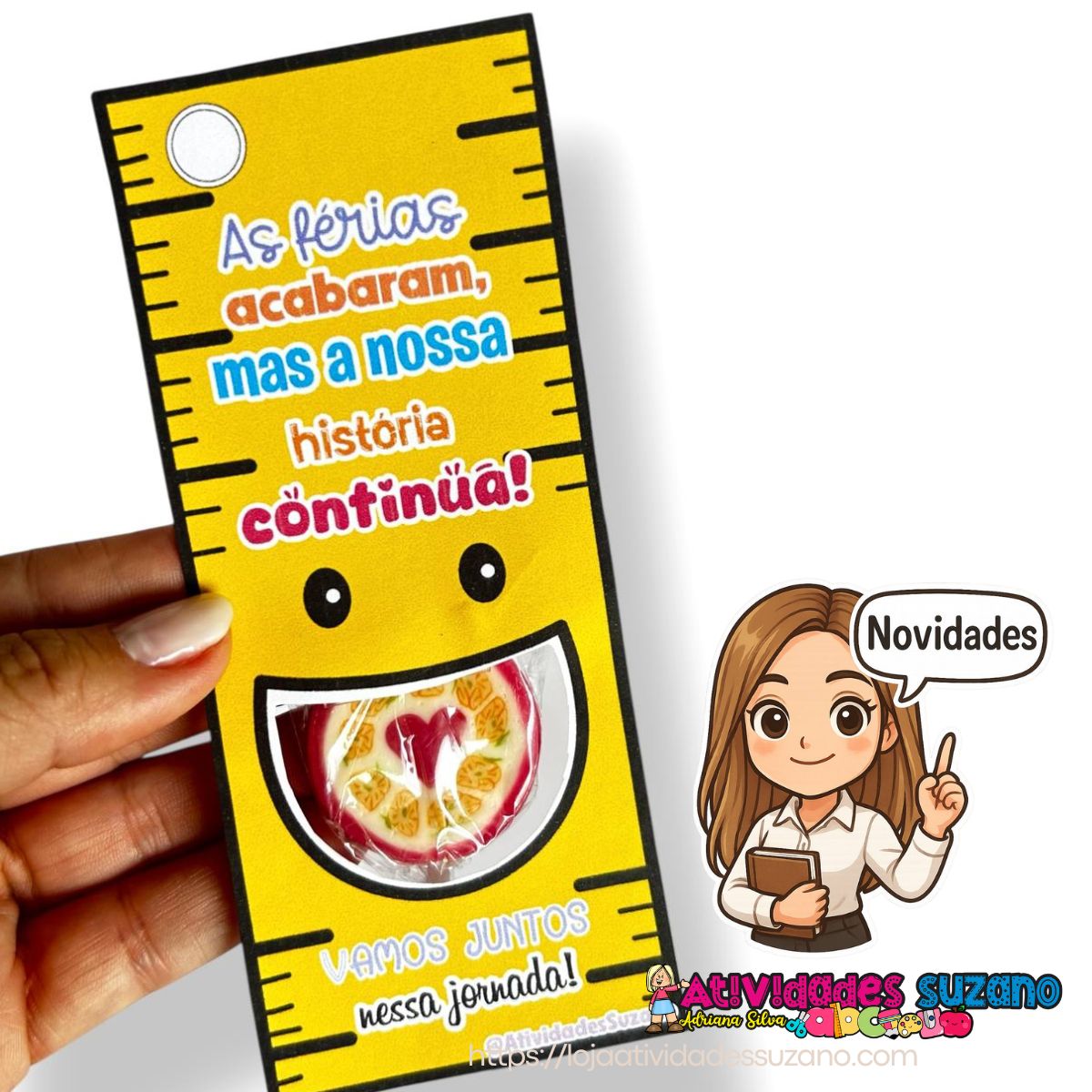Nosso cartão “As férias acabaram, mas a nossa história continua!” vem com um design divertido em formato de régua, espaço para um docinho e a mensagem perfeita para fortalecer o vínculo com os alunos logo no primeiro dia!